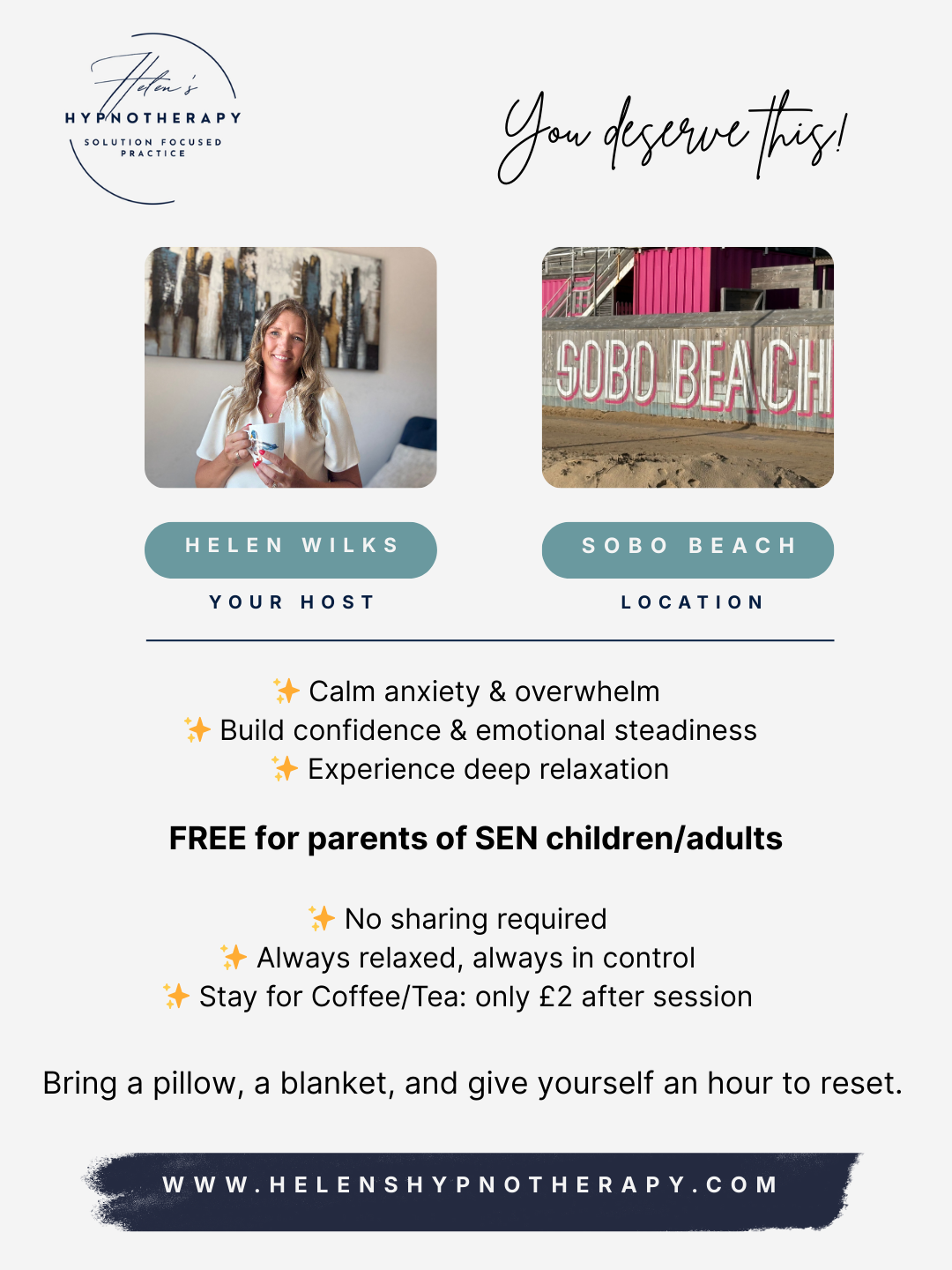 Join Helen’s Hypnotherapy in person to pause, recharge and feel supported as a parent/carer of SEN children and adults.