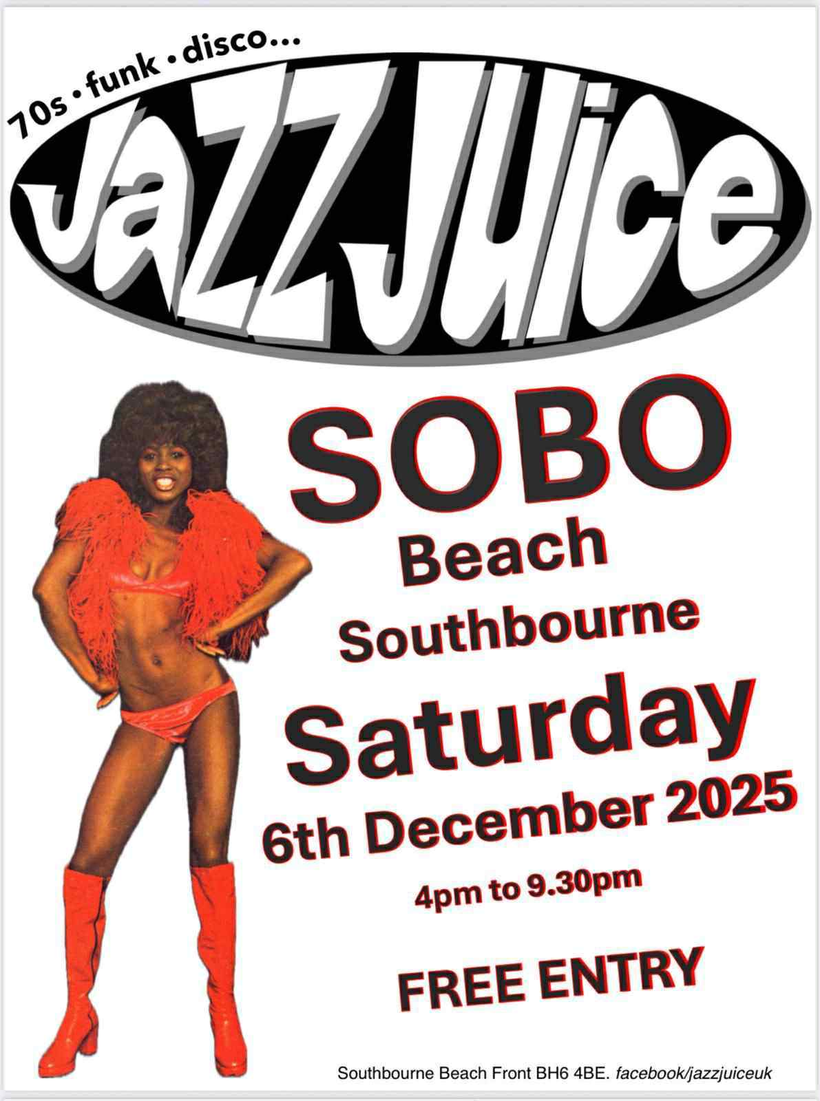 The infamous Jazz Juice returns to Sobo Beach for another Foot stomping free party… ‘get on down’ for an afternoon / eve of butt slapping funk and disco floor fillers… The winter roof is now on!